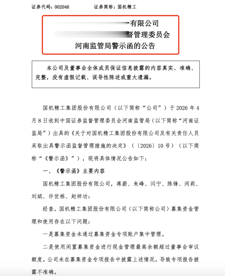 4月8日晚间,国机精工(002046)发布公告称,因在召募资金管束和使用中存在多项违纪动作,公司及两任董事长、两任总司理、三任财务总监等收到河南证监局出具的警示函,公司波及8名高管被记入证券期货商场诚信档案。