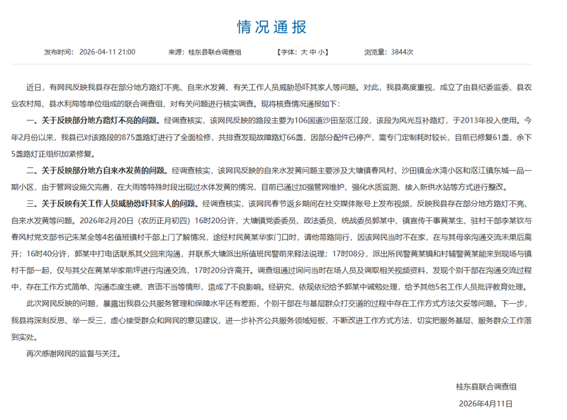 新京报讯 据桂东县东说念主民政府网站讯息,近日,有网民响应桂东县存在部分地点街灯不亮、自来水发黄、关系使命主说念主员要挟欺诈其家东说念主等问题。对此,桂东县高度喜爱,建立了由县纪委监委、县农业农村局、县水利局等单元构成的齐集造访组,对关系问题进行核实造访。现将核查情况通报如下: