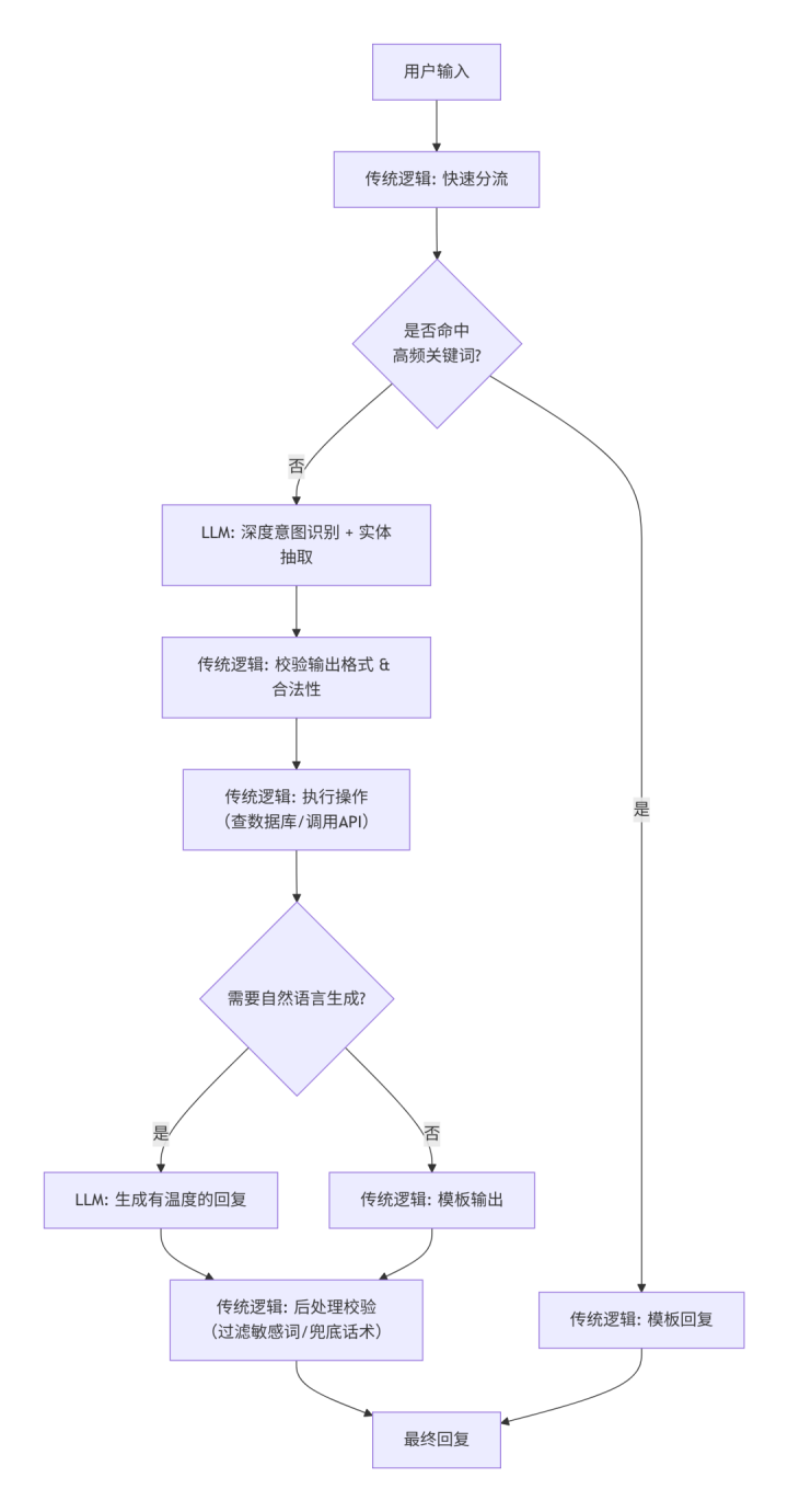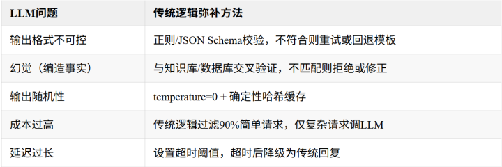 传统逻辑作念骨架,LLM作念大脑。用传统逻辑敛迹、校验、兜底LLM的输出。