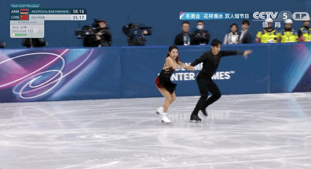 他们的开场并不告成,进行后外点冰三周跨越作时,隋固执出现了翻身诞妄。好在这对宿将组合稳住节律,随后捻转三周、抛跳三周、托举等算作均完成得干净漂亮,告成晋级。